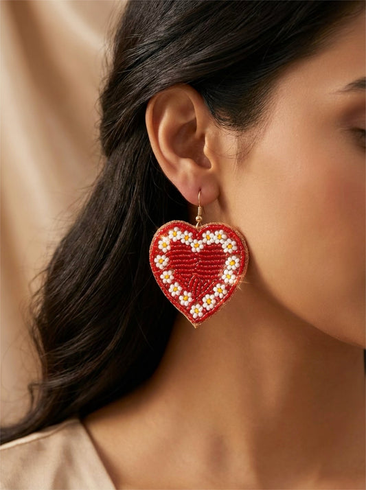 Red Floral Heart Valentine’s Day Beaded Earrings