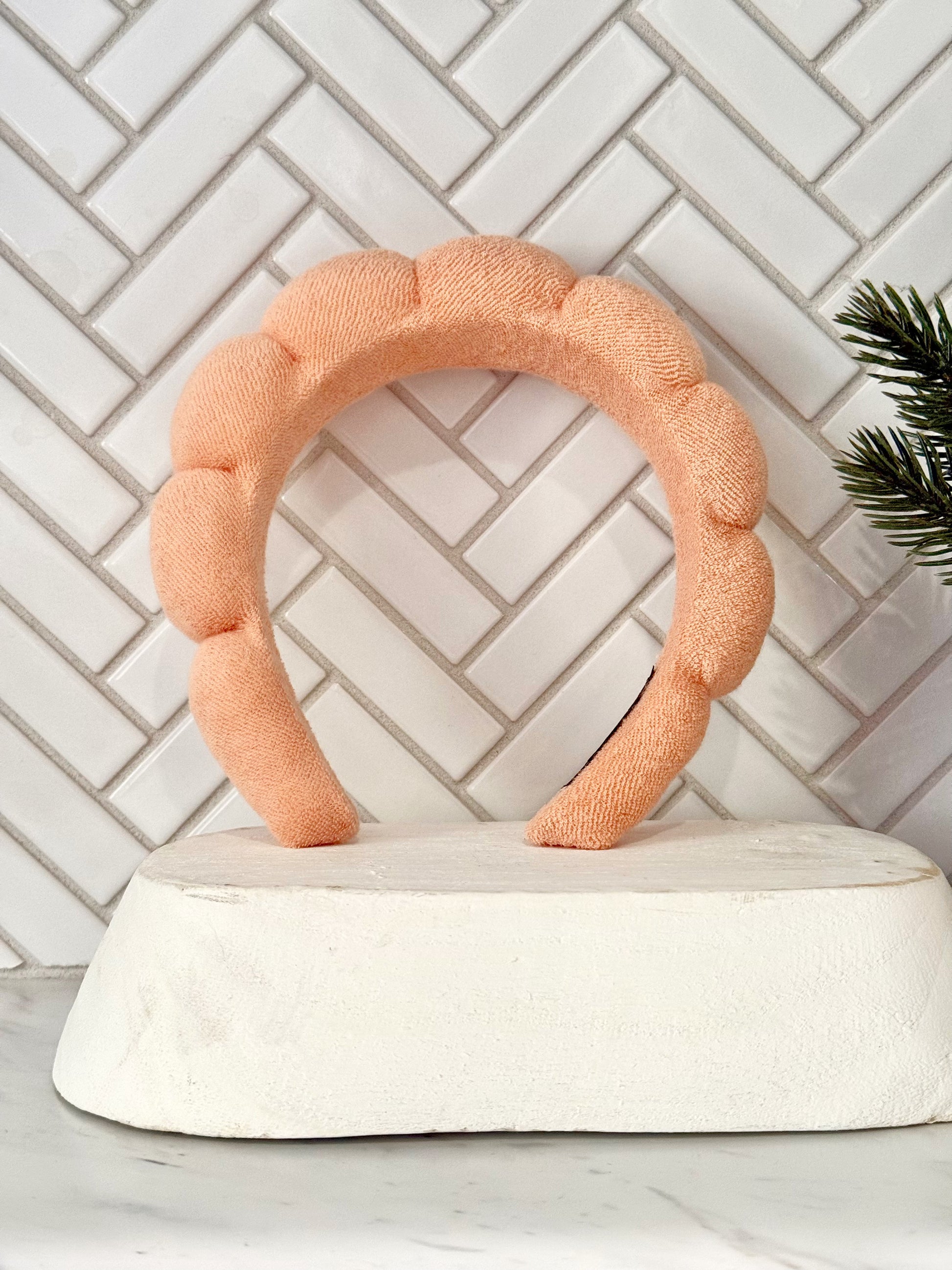 Peach puffy terry cloth headband, a perfect hair accessory for pushing your hair out of the way when washing your face, applying makeup, or for everyday wear