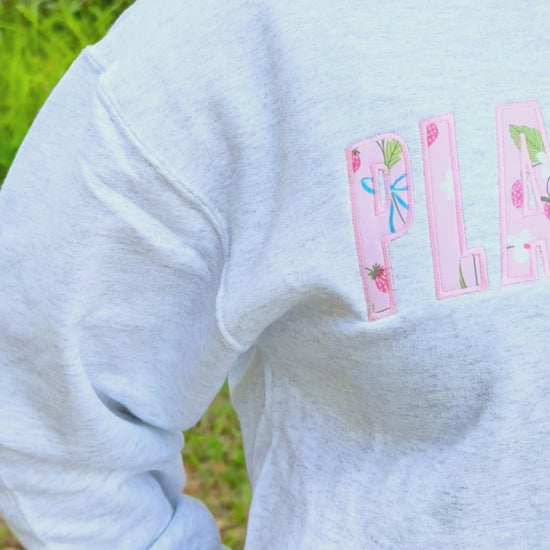 This ash gray sweatshirt was created using a pink and green strawberry floral pattern cotton material as the base, with Plant City embroidered with an appliqué and a light pink satin stitch edge. Show your Plant City pride with this unique sweatshirt!