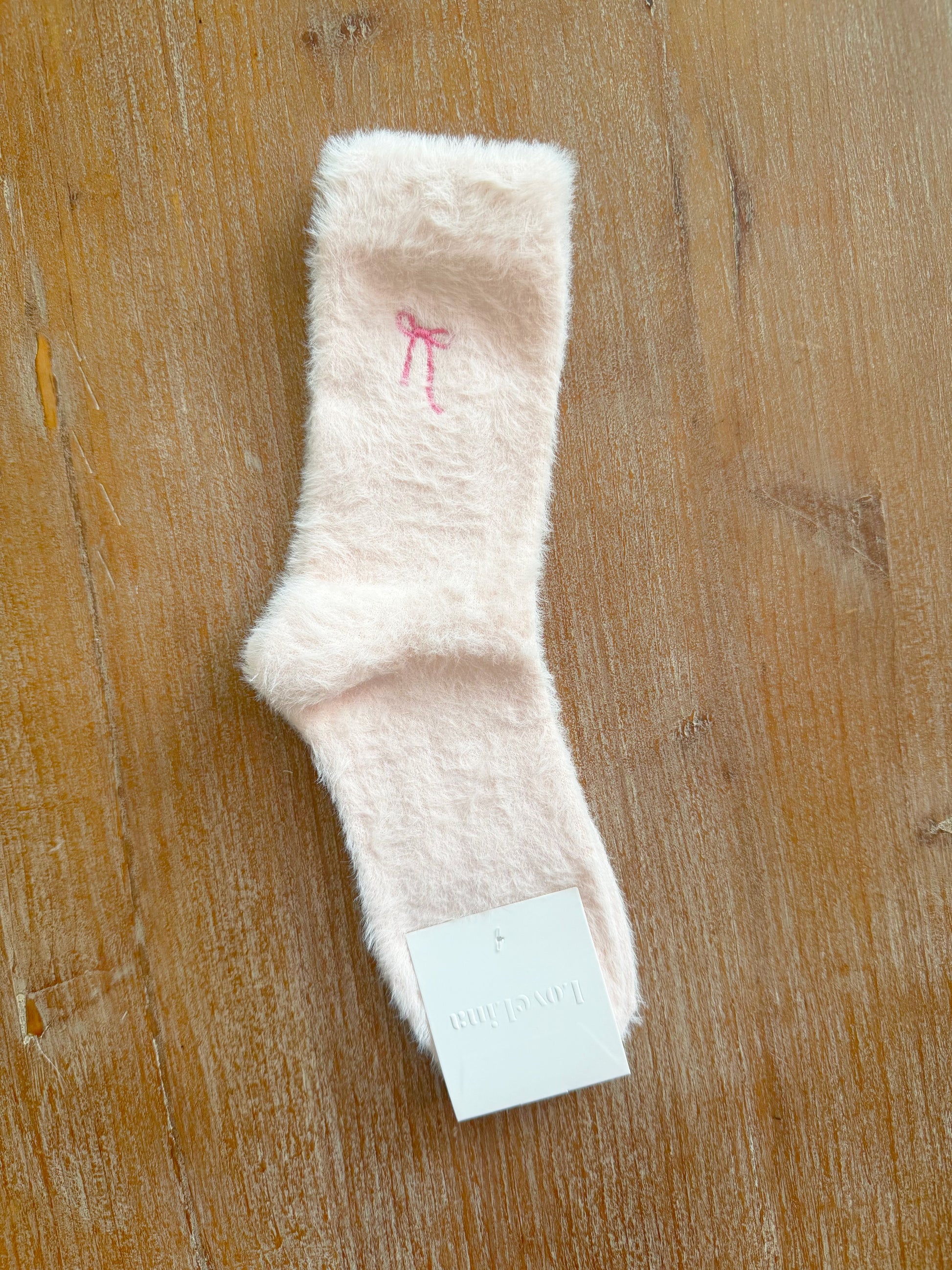 Super soft and fluffy, these socks are light pink with an embroidered bow on each sock